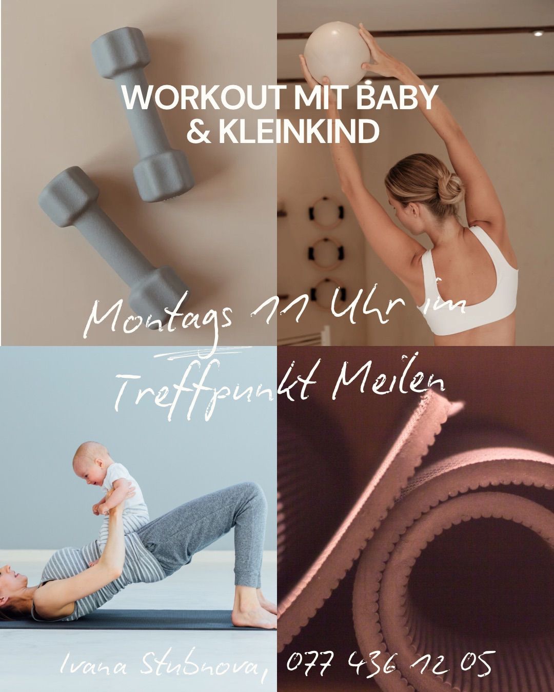 60-Minuten Training-Kombination aus Rückbildung, Body-Workout, Pilates & Cardio. Montags von 11 bis 12 Uhr mit gesundem Apèro nach dem Training. Geschwister willkommen.