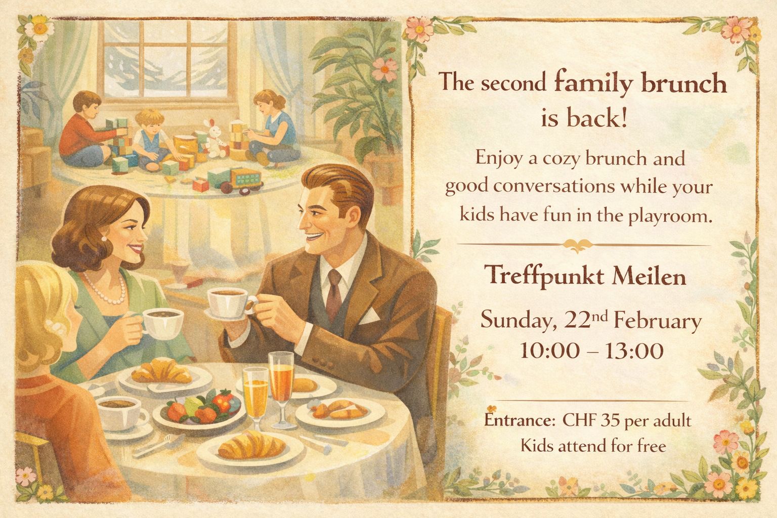 Gemütlicher Brunch für Familien mit Kindern. Unkompliziert, gemütlich und ganz in der Nähe. Mit Anmeldung. Mehr Informationen, Menü, Kosten finden Sie hier.