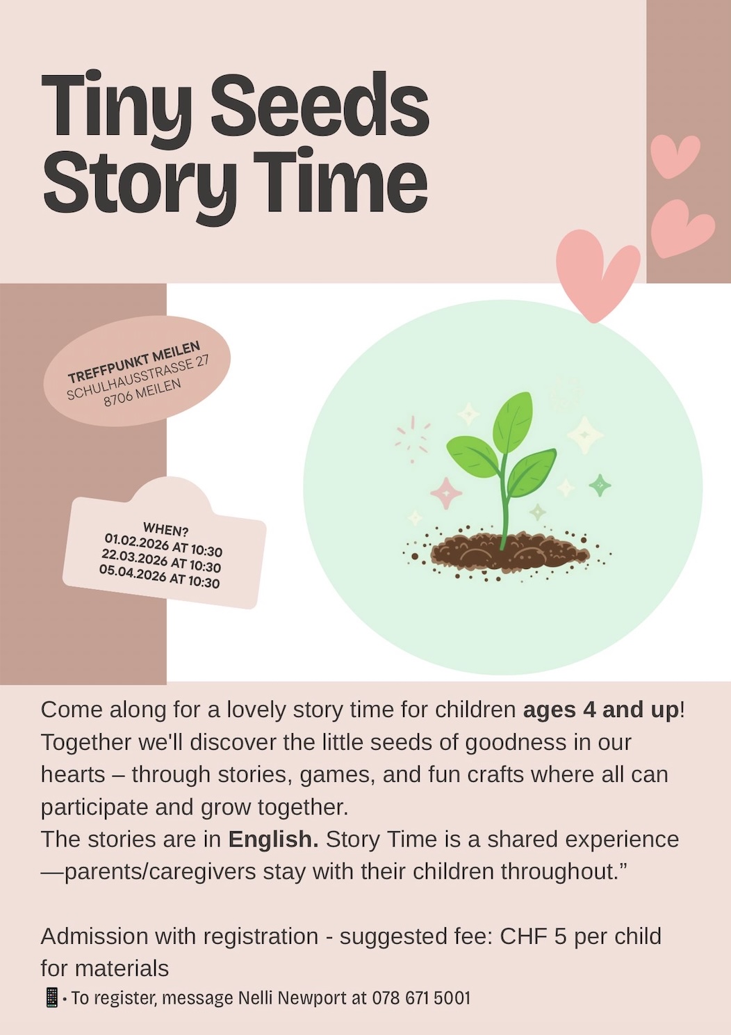 Kommt vorbei zu einer liebevollen Geschichtenzeit für Kinder ab 4 Jahren. Gemeinsam entdecken wir die kleinen Samen des Guten im Herzen – durch Geschichten, Spiele und Bastelspass. Ein Ort zum Mitmachen und Wachsen. Die Geschichten sind auf Englisch, mit deutschen Übersetzung. Anmeldung bei Nelli 078 661 5001. Eintritt 5 Chf pro Kind.